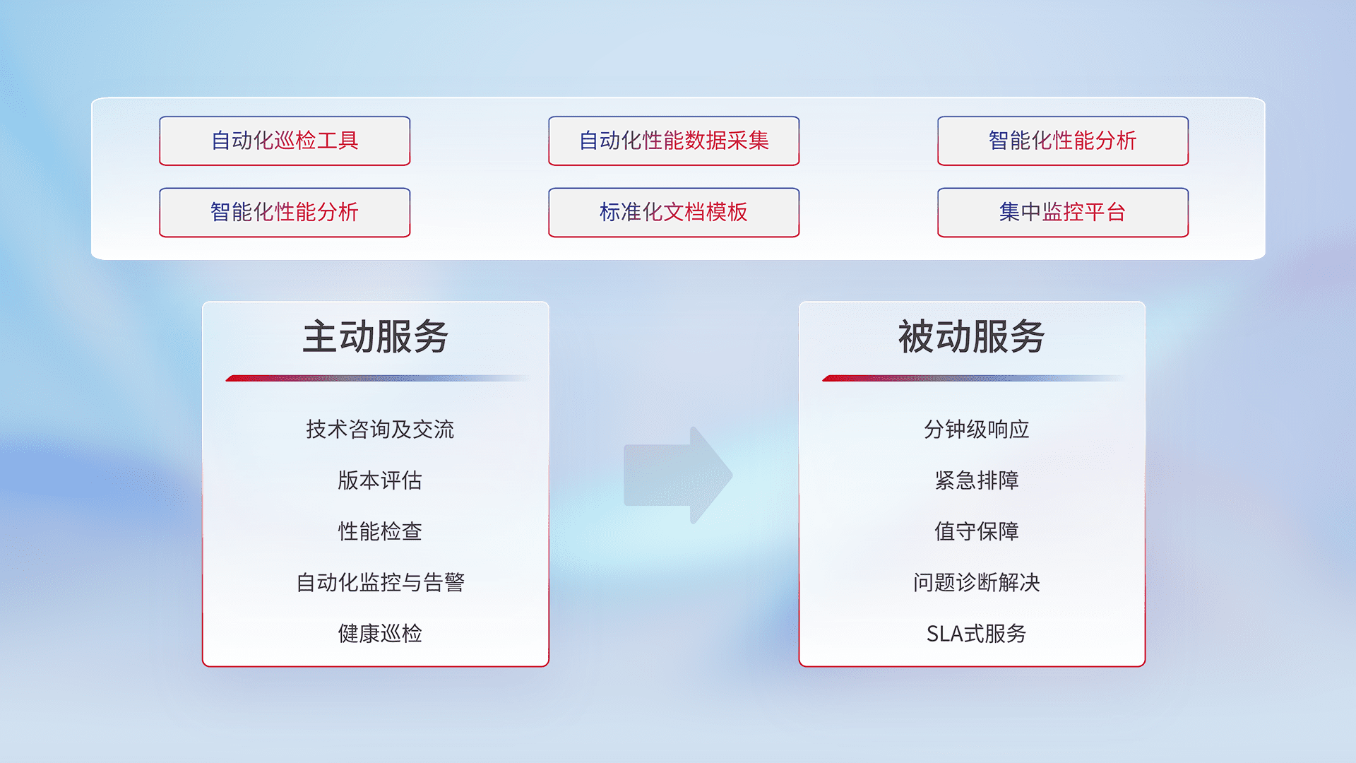 智能化工具和标准化文档,,,保障服务质量,,,,提供主动服务(包含技术咨询、、版本评估、、性能检查、、自动化监控与告警、、健康巡检)和被动服务包含(分钟级响应、、、、紧急排障、、、值守保障、、问题诊断解决、、SLA服务)。。。。